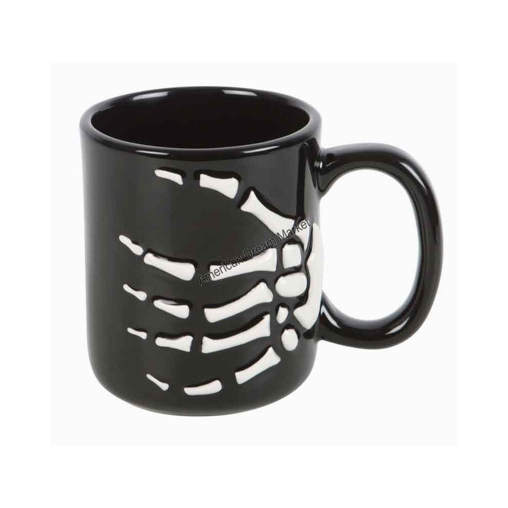 Voici un mug avec un main de squelette.